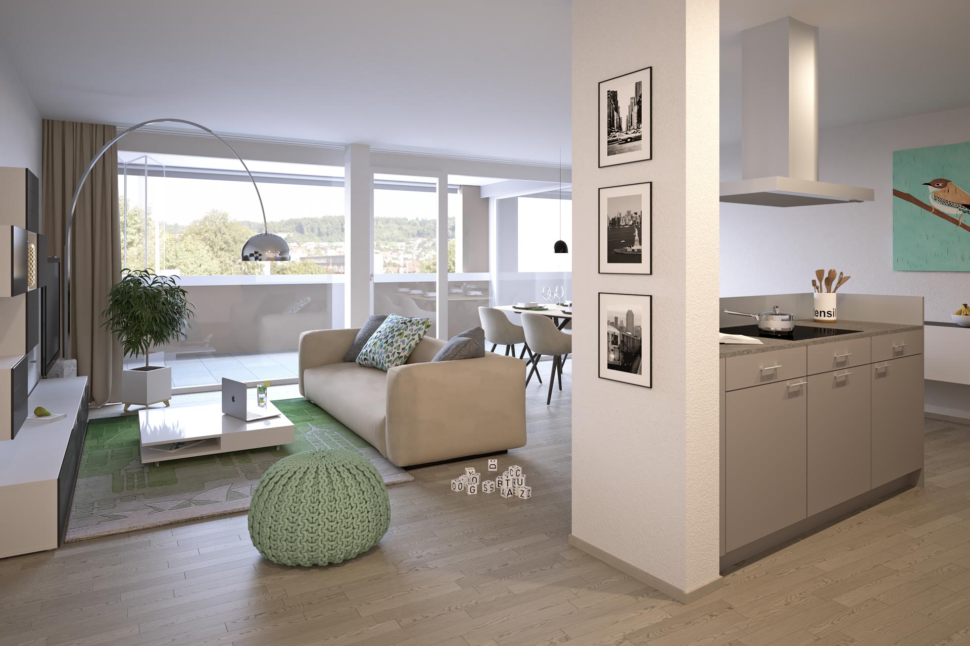 Alle Wohnräume sind durchgehend mit Parkettboden ausgestattet, auch im Küchenbereich. Die Küche ist bei den meisten Wohnungstypen mit einer Kochinsel ausgestattet. Jede Wohnung besitzt zudem einen Waschturm. Die Schlafräume sind entweder zum Innenhof, zum Park oder zur wenig befahrenen Bahnhofstrasse orientiert und dienen so als willkommene Rückzugsorte. Der offene Wohn-/Essbereich gewährt viel Flexibilität bei der Möb¬lierung; die vorgelagerten Loggien (10 – 16 m2) lassen diesen Raum besonders grosszügig erscheinen. Sie profitieren vom Nachmittag bis am Abend von reichlich Sonneneinstrahlung.